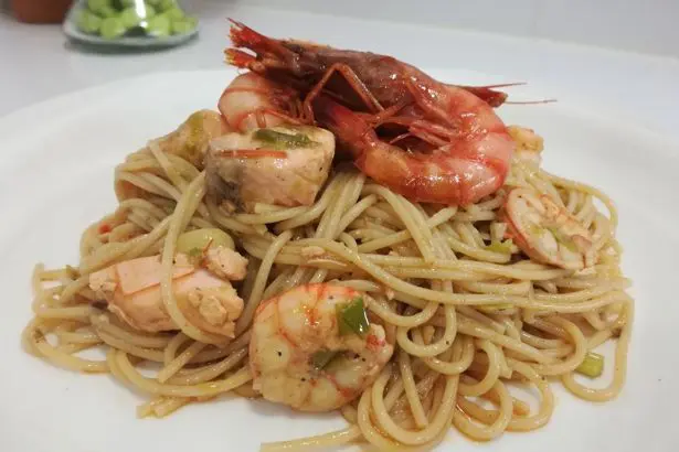 Mientras se va cociendo el salmón con el resto de ingredientes, cogemos las cabezas de las gambas y las machacamos para sacarle el zumo y lo añadimos al sofreído de ajos, gambas y salmón, así añadimos pescado azul. Para aprovechar mejor el zumo de las gambas, echamos un poco de agua a las cabezas machacadas y esta agua con el zumo de la gamba lo añadimos al sofrito. Salpimentamos y mezclamos con la pasta. Si volamos podemos añadir un chorro de aceite crudo para finalizar.